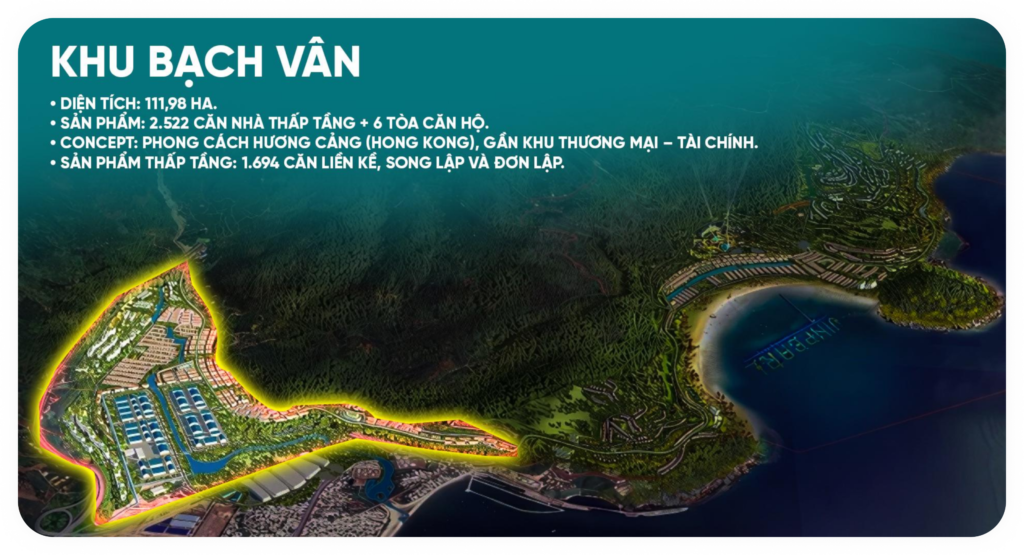 Trong tổng thể quy hoạch Vinhomes Lăng Vân, phân khu Bạch Vân được ví như “cửa ngõ phồn hoa”, là nơi đầu tiên chào đón cư dân và du khách khi bước vào đại đô thị biển 512 ha. Tọa lạc ở phía Tây Nam dự án, khu Bạch Vân mang vai trò trung tâm thương mại – dịch vụ, tái hiện phong cách sống sôi động và hiện đại của những đô thị châu Âu phồn thịnh.