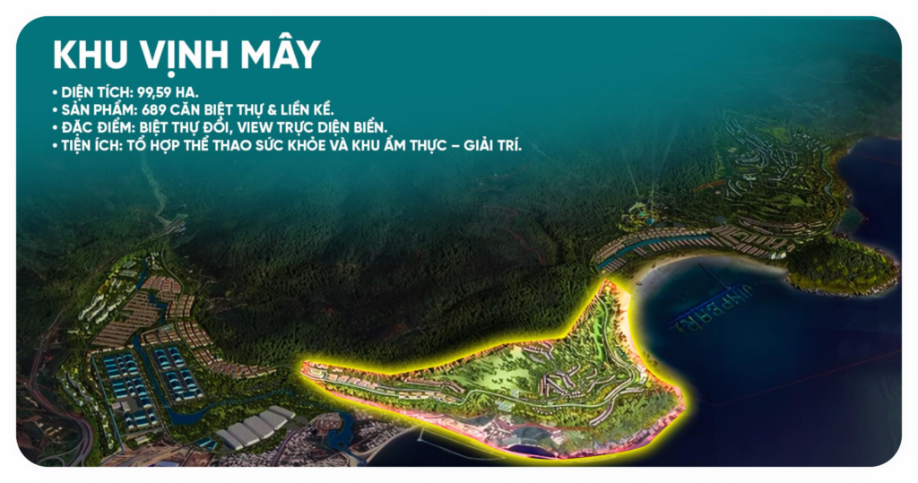 Khu Vịnh Mây quy hoạch khoảng 750 căn biệt thự ven biển cao cấp, mỗi căn đều được thiết kế tinh tế, hòa quyện với thiên nhiên và hướng tầm nhìn khoáng đạt ra đại dương. Bên cạnh đó, nơi đây còn nổi bật với hệ thống hạ tầng Panorama view biển, ga tàu Railway và vịnh phong bán hàng chính thức của dự án. Tất cả góp phần tạo nên một không gian sống sang trọng, riêng tư nhưng vẫn đầy đủ tiện ích nghỉ dưỡng.